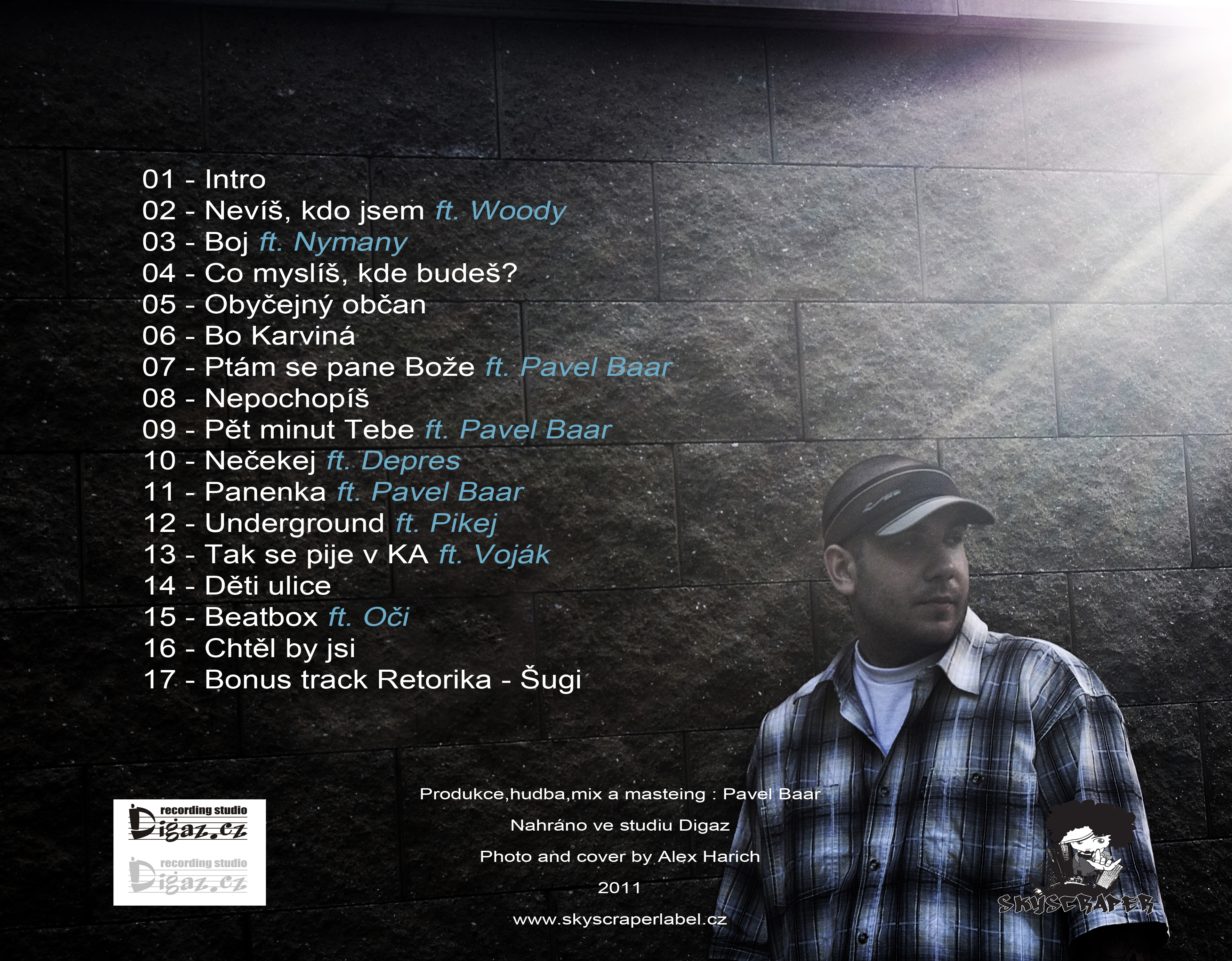 Deska obsahuje 18 věcí včetně skrytého bonus tracku a koupit si ji můžete na stránkách Skyscraper labelu, pod kterým album i vyšlo. Nevíš, kdo jsem je kompletně nahrané ve studiu DiGaZ a o produkci, mix a mastering se postaral Pavel Baar, který má na svědomí i všechny beaty. Cover alba si vzal na starost Alex Harich.