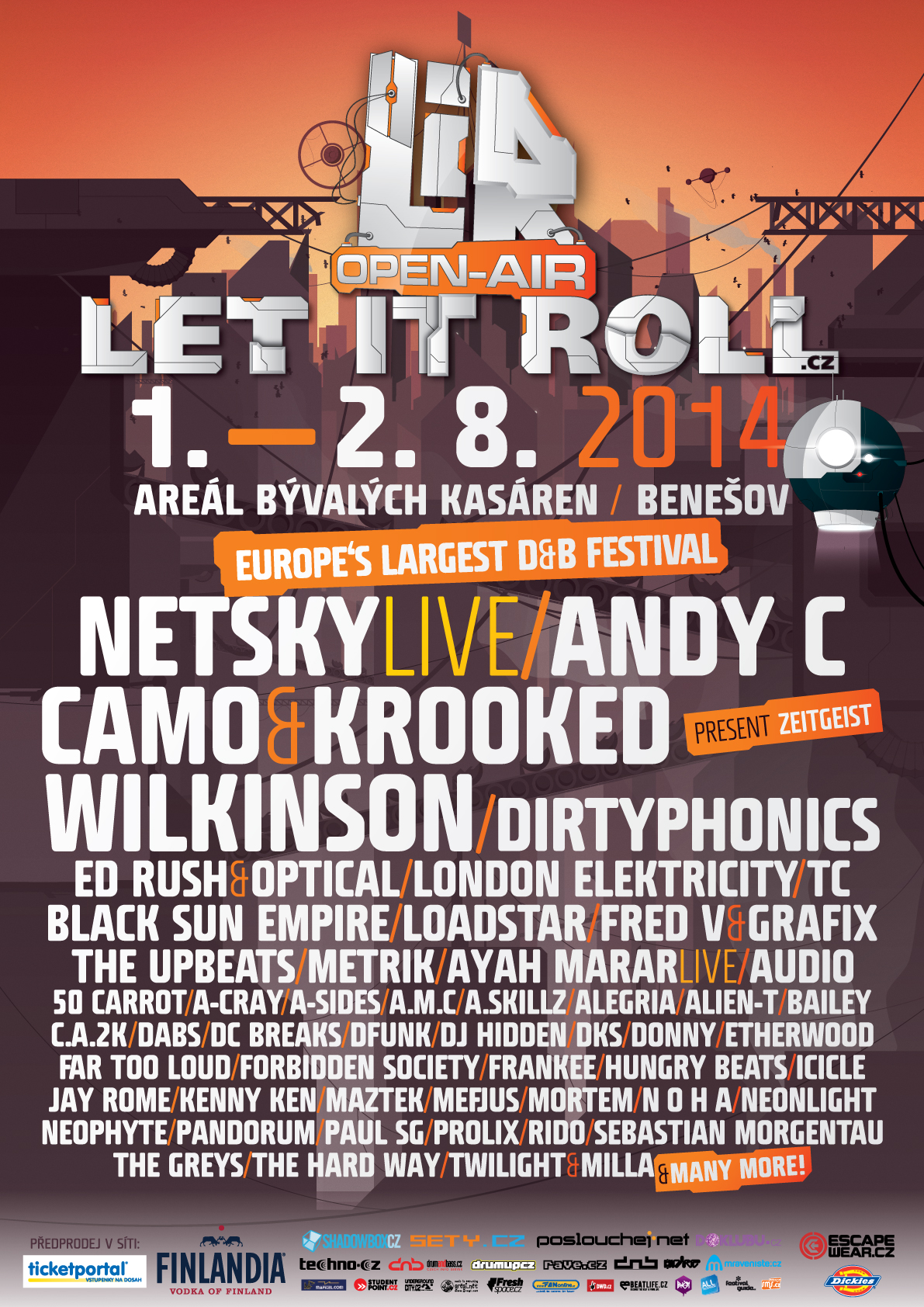 Na festivalu Let It Roll Open Air 2014 se opět sejdou zástupci špičky světové elektronické scény, zejména producenti drum&bassu, dubstepu a electra. Mezi hlavní taháky programu čítajícího 53 zahraničních producentů a DJs patří projekt Netsky Live, který v současné době patří mezi nejžádanější live vystoupení elektronické hudby na světě. Na festivalu společně s Netsky Live vystoupí také rakouské duo Camo & Krooked, kteří v ČR poprvé představí svou live show Zeitgeist. Dále se můžete těšit na francouzské velikány Dirtyphonics, pro letošní rok nejúspěšnějšího drum&bassového producenta Wilkinsona. Festival Let It Roll poctí svou návštěvou i ,,šéfové,, dvou největších d&b labelů současnosti, vždy usměvavý Tony Colman aka London Electricity (Hospital Records) a světová DJská jednička Andy C ( Ram Records).