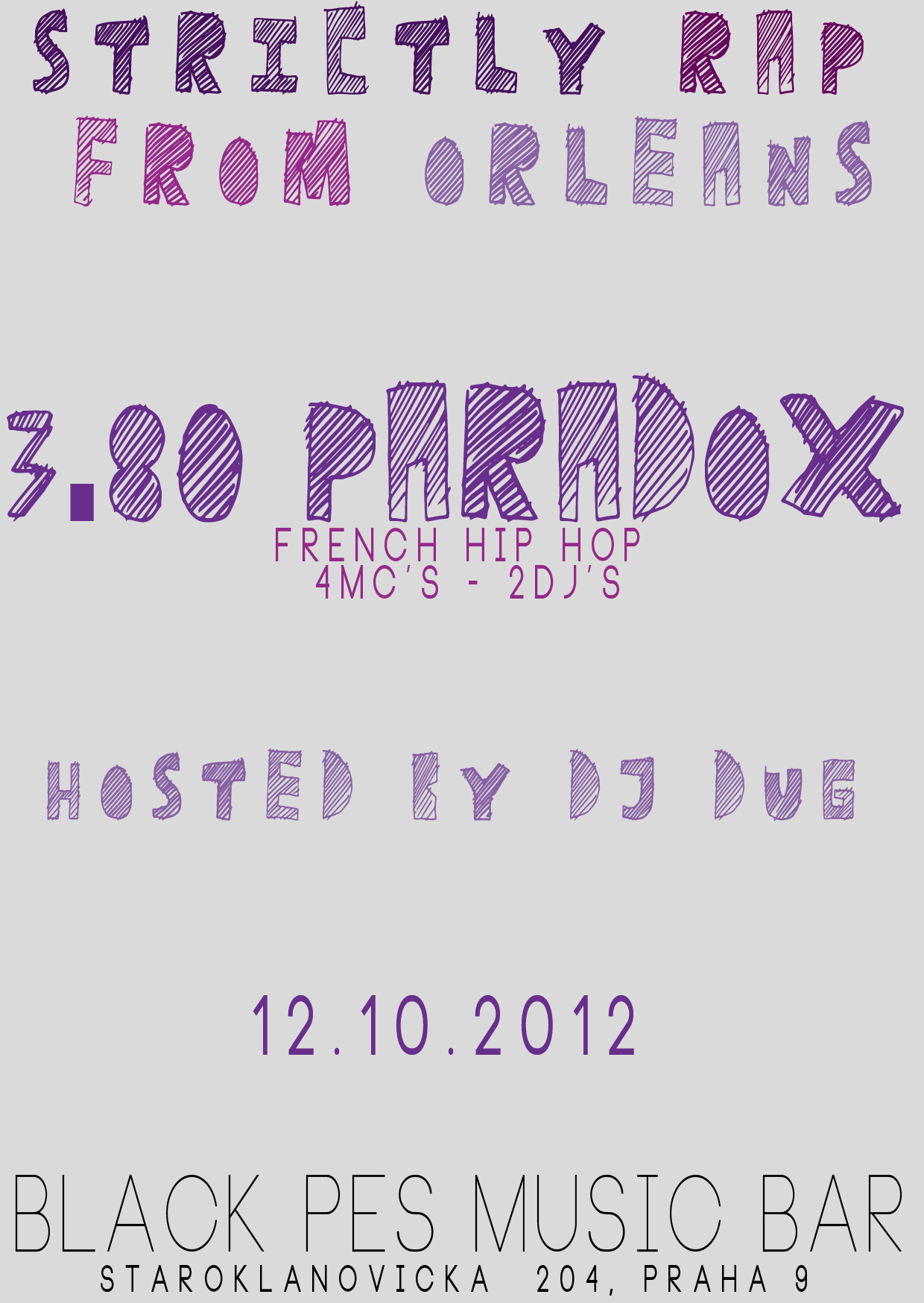 3.80 Paradox – 2 DJs a 4 MCs (Dino. S, D Spy, RossKilla, Lowtantik a beatmakeři Prodi & Doubleko), energická show, striktní francouzský hip hop a koncert, který nenechá žádného diváka v klidu, to vše přiveze kapela z Orleans do tří českých klubů. Premiérově se tahle parta představí v břeclavském Park klubu ve čtvrtek 11. října. O den později 12. 10. zamíří do klánovického prostoru Black Pes a po necelém roce se v sobotu vrátí i do pražského Červu.