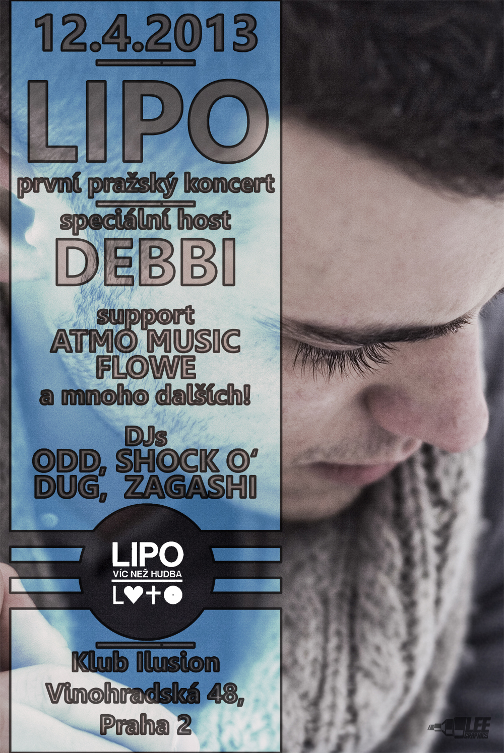 Dveře nově zrekonstruovaného klubu Ilusion se otevřou ve 20:00 a hned od začátku zabaví návštěvníky DJs: Dug, Zagashi a Shock O´. Po deváté se na pódiu začnou střídat předskokané Dryll, Vojtaano a On Timon, trutnovský Austy a diváky rozhýbe i Freestyle Mondays crew s živou kapelou a zpěvačkou Flowe. Právě to bude příležitost pro rapery či beatboxery v publiku, protože kapela bude hrát ve stylu hip hopu a mikrofon můžeš vzít do ruky třeba i ty! Než nastoupí na stage hlavní hvězda večera, přijde řada na černé koně, které vybral Lipo sám. Těmi bude liberecká formace Atmo Music aka Beef a ODD. Právě ODD je autorem mnoha podmazů pro své známější kolegy a jedním z nich je třeba úspěšný track Retard Paulieho Garanda. ODD se navíc představí i v roli DJe po skončení koncertu.